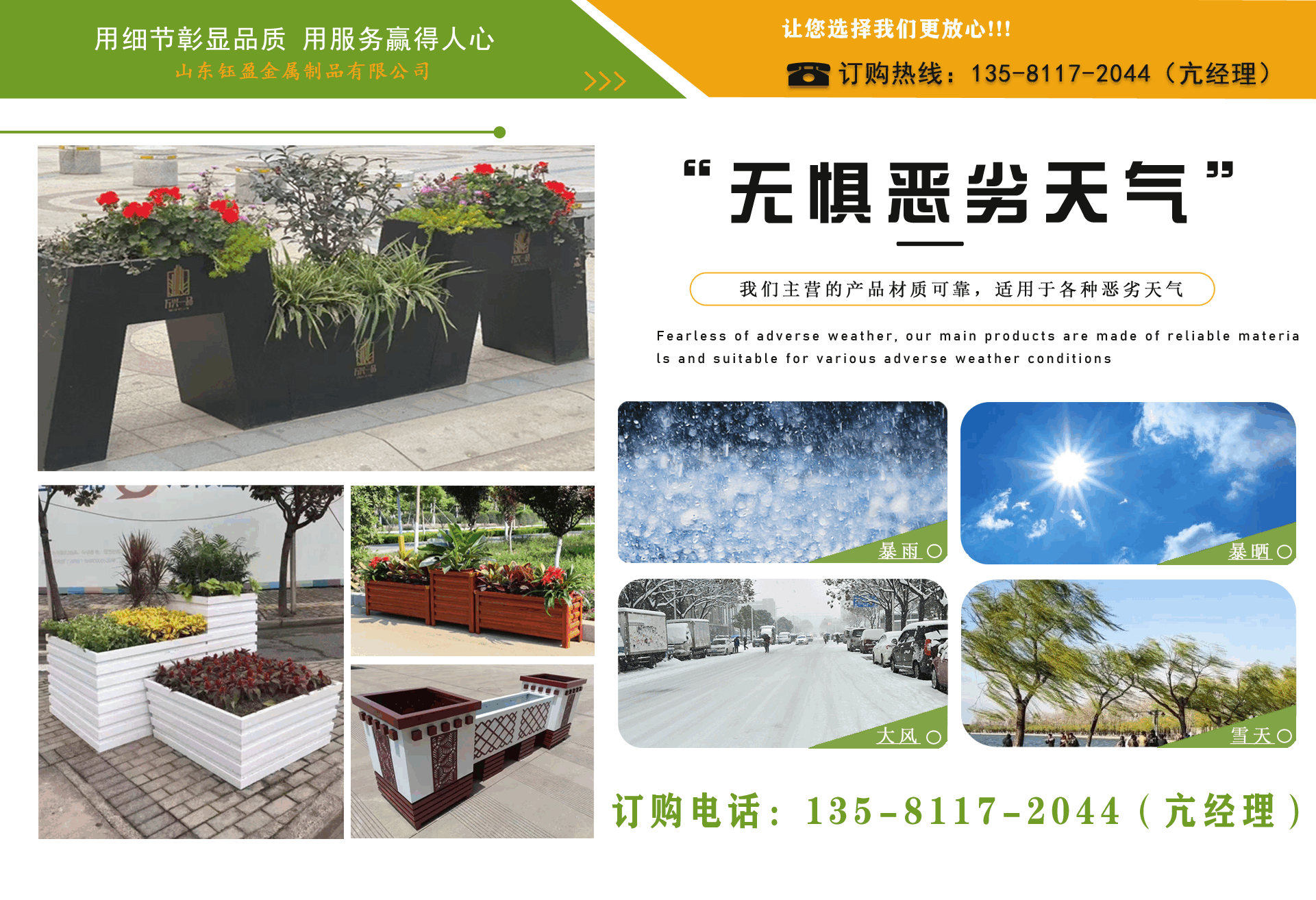 山東鈺盈金屬制品有限公司主營鍍鋅板花箱,道路隔斷花箱,定制花箱,戶外道路花箱,花箱座椅等產(chǎn)品,產(chǎn)品結(jié)構(gòu)合理、性能優(yōu)良,具有強度高、耐腐蝕、抗老化、隔熱隔音、節(jié)約能源、外形美觀、使用壽命長等優(yōu)點,深受國內(nèi)外客戶認(rèn)可。 我們根據(jù)客戶所在城市的文化特征,制造出符合當(dāng)?shù)爻鞘形幕瘹庀⒌淖匀涣Ⅲw、觀賞性強的花箱產(chǎn)品成為城市里一道靚麗的風(fēng)景線?! 」緦嵭姓\實、公正、守信、價格合理、平等互利?! 」緫{借雄厚經(jīng)驗實力,恪守誠信為本的原則,得到了眾多客戶的信賴,并在業(yè)界獲得良好的口碑。建立了穩(wěn)固的合作關(guān)系,隨著業(yè)務(wù)的不斷發(fā)展和壯大,合作伙伴的范圍也在不斷擴大。我們熱情盼望與您的合作,為社會的可持續(xù)發(fā)展獻(xiàn)上一份努力。...