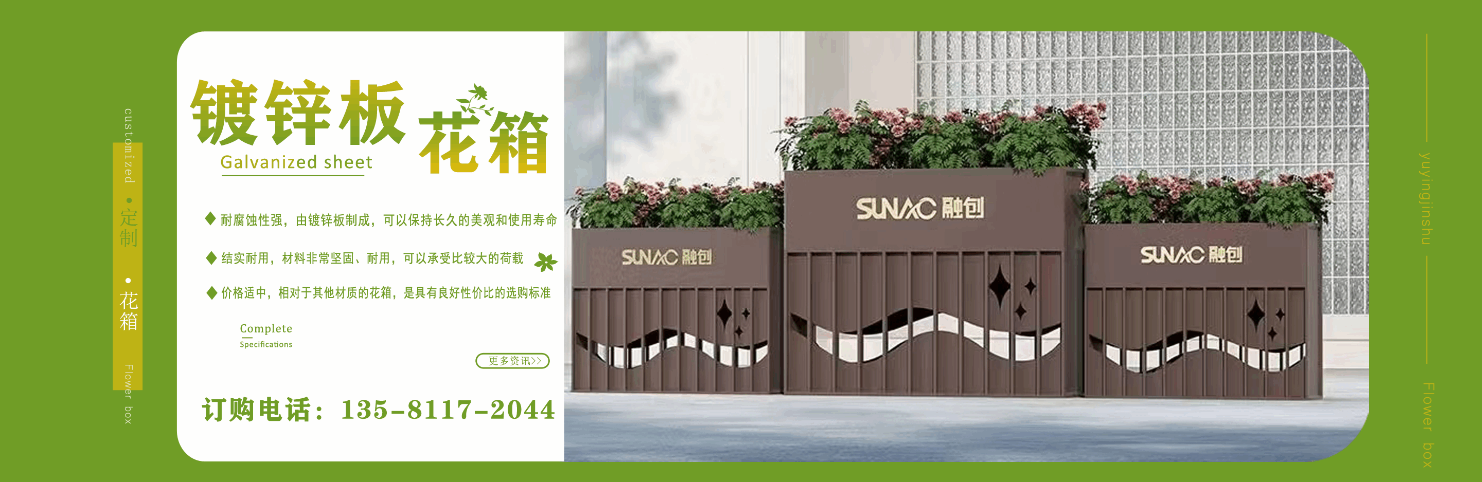 山東鈺盈金屬制品有限公司主營鍍鋅板花箱,道路隔斷花箱,定制花箱,戶外道路花箱,花箱座椅等產(chǎn)品,產(chǎn)品結(jié)構(gòu)合理、性能優(yōu)良,具有強度高、耐腐蝕、抗老化、隔熱隔音、節(jié)約能源、外形美觀、使用壽命長等優(yōu)點,深受國內(nèi)外客戶認(rèn)可。 我們根據(jù)客戶所在城市的文化特征,制造出符合當(dāng)?shù)爻鞘形幕瘹庀⒌淖匀涣Ⅲw、觀賞性強的花箱產(chǎn)品成為城市里一道靚麗的風(fēng)景線?! 」緦嵭姓\實、公正、守信、價格合理、平等互利?! 」緫{借雄厚經(jīng)驗實力,恪守誠信為本的原則,得到了眾多客戶的信賴,并在業(yè)界獲得良好的口碑。建立了穩(wěn)固的合作關(guān)系,隨著業(yè)務(wù)的不斷發(fā)展和壯大,合作伙伴的范圍也在不斷擴大。我們熱情盼望與您的合作,為社會的可持續(xù)發(fā)展獻(xiàn)上一份努力。...